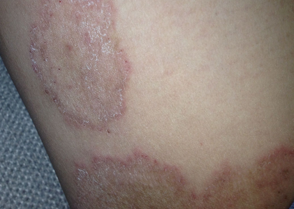 常发生于阴囊对侧的大腿皮肤,一侧或双侧,多呈环状或半环状斑片。初于股上部内侧出现小片红斑,其上有脱屑,并逐渐扩展而向四周蔓延,边界清楚,其上有丘疹、水疱、结痂。中央部位可自愈,有色素沉着或脱屑,历久则于局部皮肤发生浸润增厚呈苔藓化,常伴痒感。严重者常扩展波及股内侧、会阴或肛门周围,其下缘多清晰。