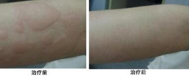 荨麻疹:系多种不同原因所致的一种皮肤粘膜血管反应性疾病。表现为时隐时现的、边缘清楚的、红色或白色的瘙痒性风团,中医称“瘾疹”,俗称“风疹块”。一般风团形状不一、大小不等,颜色苍白或鲜红,时起时消,单个风团常持续不超过24~36小时,消退后不留痕迹。患者自觉瘙痒剧烈,少数伴发热、关节肿痛、头痛、恶心、呕吐、腹痛、腹泻、胸闷、气憋、呼吸困难、心悸等全身症状。