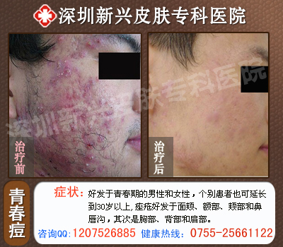 深圳新兴皮肤病医院皮肤专家经过多年反复临床实践与科学论证,成功推出能彻底治疗青春痘的“中药光动力机体疗法”。该疗法运用局部治疗+激素调节的原理,可同时达到排毒,杀菌,抑菌、修复受损细胞、恢复皮肤生态平衡、去痘不留痕的多重功效,而且对痤疮各期,痤疮印记,痤疮凹疤均可进行全面系统的治疗,近几年的临床成功经验证实,众多患者在短期内实现了彻底根治的目的,治愈率高达97.8%。