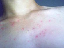 2、发病部位以颜面为多,亦可见于胸背上部及肩胛处,胸前、颈后、臀部等处自觉可稍有瘙痒或疼痛,病程缠绵,往往此起彼伏,新疹不断继发,有的可迁延数年或十余年。如下图:
