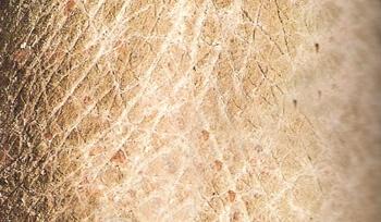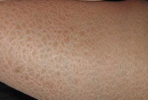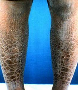 但是一进入秋天,气温降低,气候干燥,该物质一经分泌到皮肤表面就迅速凝固,并且皮肤水分减少,无法有效溶解该物质,因此它就凝结、沉积于皮肤角质层。其结果一方面对皮肤产生损害,使皮肤角化速度大大加快产生大量的鳞屑;另一方面堵塞了毛囊和汗腺导管,导致皮脂腺、汗腺分泌障碍,最终发生痿缩,皮肤失去滋润,变得异常干燥。由于全身皮脂腺、汗腺的分布差异以及个体体质的不同,分别从皮脂腺、汗腺上分泌代谢遗留物的多寡也不一,因此表现为特定部位的皮损、不同类型的鱼鳞病以及轻重不同的症状。