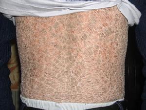 2、性连锁隐患性鱼鳞病:可于生后或婴儿发病。皮损鳞屑大而显著,呈黄褐色或污黑色大片鱼鳞状,皮肤干燥粗糙,往往遍布全身,腋窝、及肘窝等部位亦可受累;腹部、背部尤重。如面部受累,则仅限于耳前及颜面侧面。一般不发生毛囊角化。掌趾处皮肤正常,皮损不随年龄增长而减轻,有时反而增重。