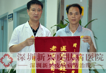 看到记者,蒋先生表现的很坦然,他说自己以前是个银屑病患者,看过很多地方,吃过很多药都没见效,没想到深圳新兴皮肤病专科医院专家沈朝禄主任把他多年的老毛病给治好了,他心里对沈主任非常感激,于是便带着锦旗冒着雨来到医院。