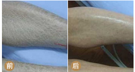 晴女士 66岁 自述鱼鳞病多年,近来脱屑严重,前来求诊。临床观察,四肢皮肤干燥、粗糙,皮肤表面见淡褐色鱼鳞样固着性鳞屑,以伸侧为重,并累及双脚皮肤。干燥、无光泽,内侧白屑增多,脱落。经我院使用"MOIST多维汽雾祛鳞疗法"进行治疗,并结合全身中药浴,中药汽疗,LED红光、局部外用药治疗后封包,促进药物吸收综合治疗。收到了明显治疗效果。患者精神食纳好,四肢皮损消退,伴有少量的脱屑,皮损尚呈淡褐色,表面光滑,细腻。