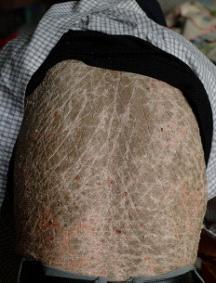 主述:有10年的疾病史,四肢腹部臀部干燥粗糙,呈淡褐色至深褐色;大量菱形或多角形鳞屑附着于皮肤,无明显不适症状,偶有瘙痒。 检查诊断:为其进行检查,诊断为寻常型鱼鳞病中度。 |
