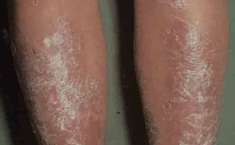 2、牛皮癣的小腿部皮损:牛皮癣的症状有哪些,皮损易浸润肥厚,伴苔癣样变,颇似慢性湿疹。