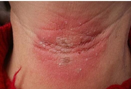 侵害部位主要以没有衣物遮蔽的暴露部位为主,如头面、颈、胸背及四肢等处。多在清晨起床后,突然发现皮损。基本损害为水肿性红斑,其上可见小丘疹、水疱和脓疱,呈一排至数排或不规则地密集排列,中央常见糜烂及渗出。皮损多为条索状、斑片状,因自身接种的皮疹常为抓痕状,皱褶部位尚可见“接吻”性损害。轻者有痒及烧灼感,重者剧痛。皮肤严重损伤及范围广泛者可有头痛,头晕及发闷,局部淋巴结肿大等症状。