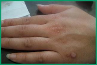 寻常疣是千日疮的中医名称,俗称刺瘊,由HPV-2.4型、7型引起,儿童及青少年易患该病,常见于手背、手指及足缘等处,小丘疹状,表面角化粗糙,坚硬,呈灰黄、污黄或污褐色。呈乳头瘤样增生,角化过度间角化不全,棘层上部及颗粒层细胞有空泡化。表皮突处长,疣周围向内弯曲呈抱球状,真皮乳头上延,血管扩张。寻常疣病程一般为1-2年,有自限性,可自行消退,也可大规模导致全身发病。
