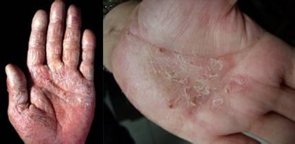 之后在当地医院,大夫诊断为:掌趾脓疱病,给予膏药治疗,用了之后见效,心里非常高兴;可是没过几天就复发,接着抹药膏;就这样反反复复,最后抹膏药也不管用了,而且面积也扩散了,并感染到手部。病情发作时,手脚发痒,常挠得出血。夜间瘙痒加剧,严重影响睡眠质量。